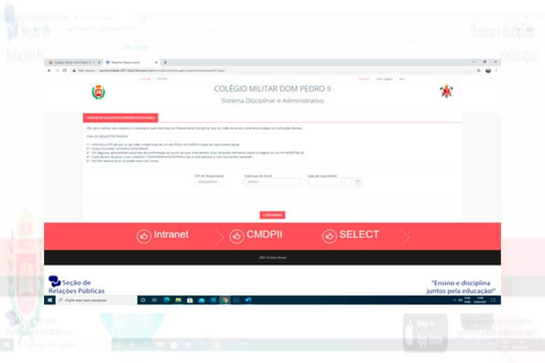 O Comando do Corpo de Alunos do Colégio Militar Dom Pedro II solicita aos pais/responsáveis que atualizem os seus dados, conforme orientação abaixo, com o objetivo de receber as Notificações de Medidas Disciplinares (F.O) através do e-mail cadastrado. Confira o passo a passo a seguir: