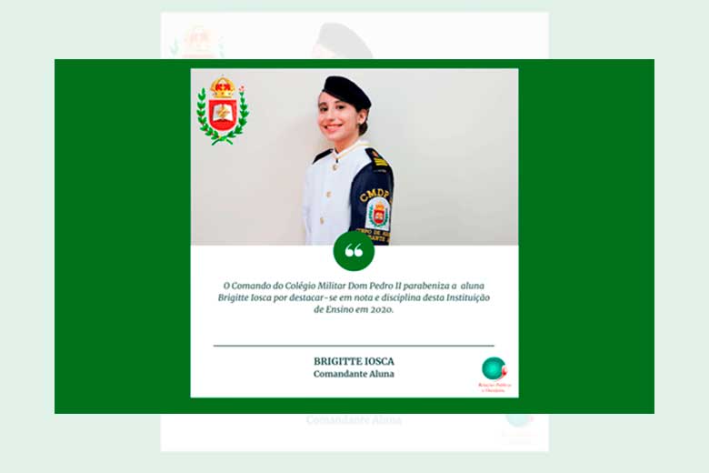 O Comando do Colégio Militar Dom Pedro II parabeniza a aluna Brigitte Iosca Viero Matos e Ferreira, da 3ª série do Ensino Médio, turma B, por ser a atual Comandante Aluna do CMDP II, ao alcançar as maiores médias de notas no ano letivo de 2020.
