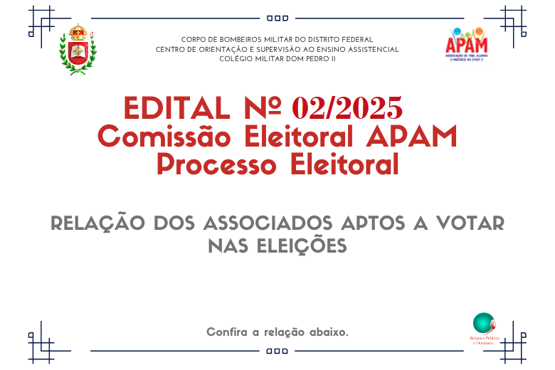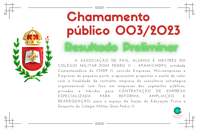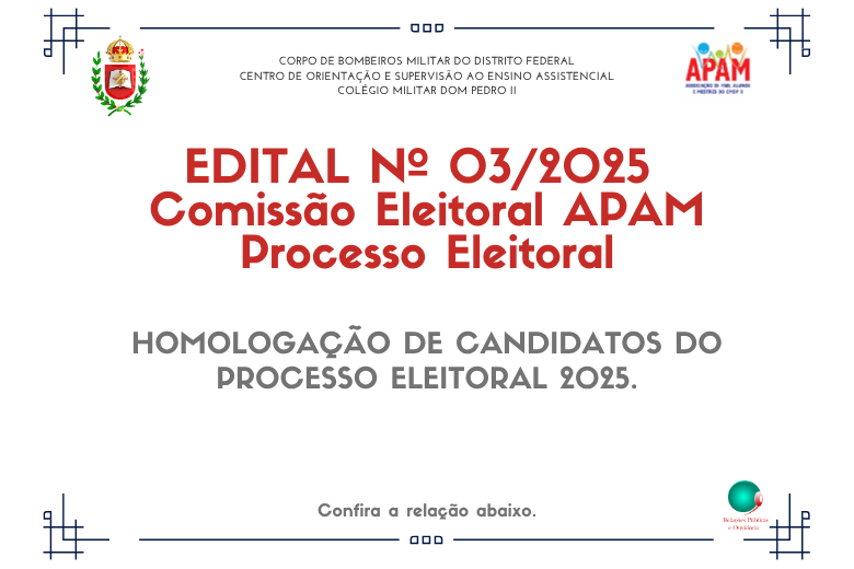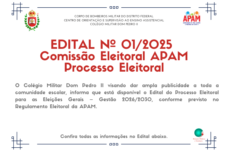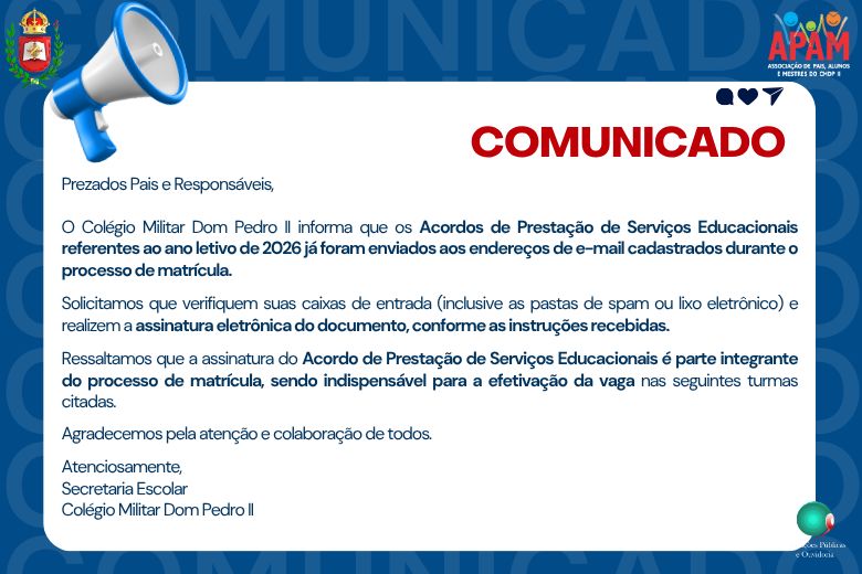 O Colégio Militar Dom Pedro II informa que os Acordos de Prestação de Serviços Educacionais – Ano Letivo de 2026 já foram enviados aos novos alunos que participaram dos processos seletivos da Educação Infantil I (Unidade Asa Sul) e 2º, 3º e 4º anos do Ensino Fundamental I (Unidade Taguatinga/Ceilândia).