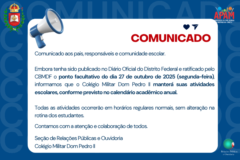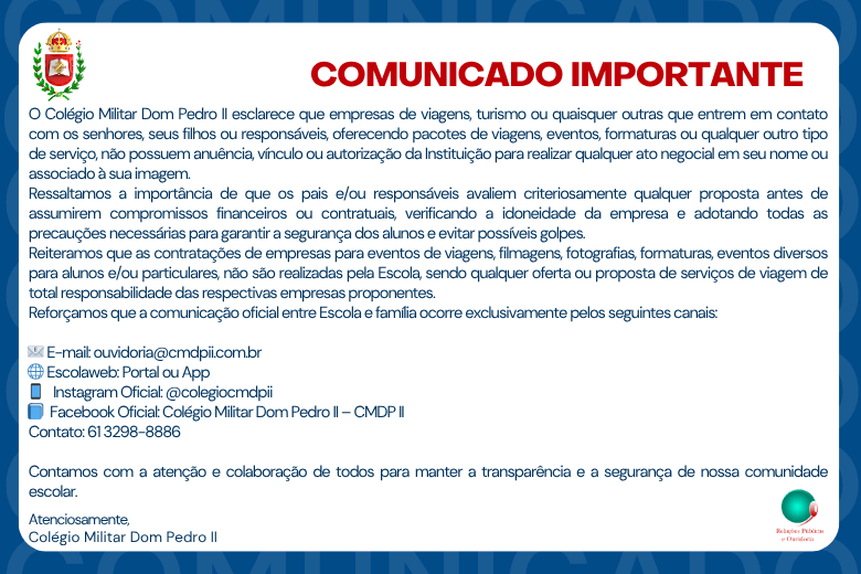 O Colégio Militar Dom Pedro II realiza esta consulta com o objetivo de ouvir o posicionamento da comunidade acerca da proposta de contratação de professores por meio da Secretaria de Estado de Educação do Distrito Federal (SEEDF).