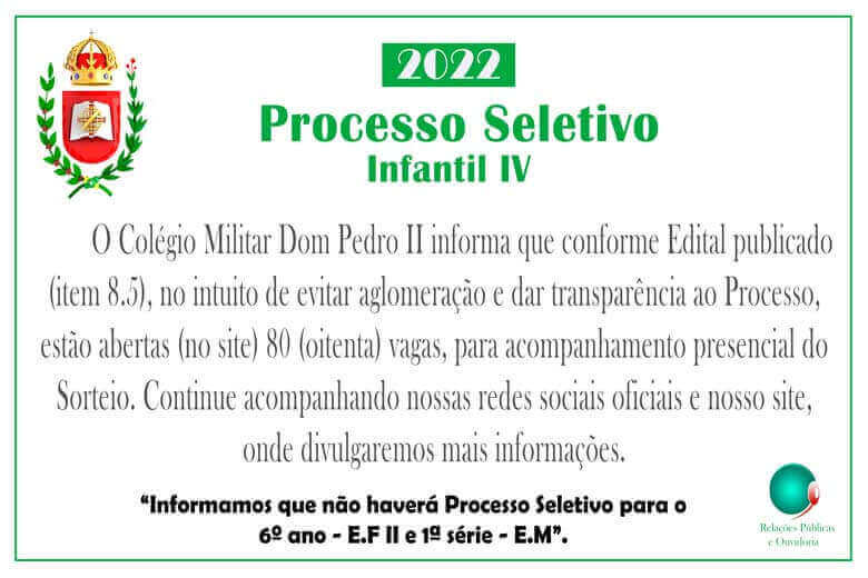 Em virtude do Decreto nº 40.924, que declarou calamidade pública em todo o Distrito Federal, em decorrência da pandemia causada pelo novo coronavírus, no intuito de evitar aglomeração de pessoas e objetivando dar transparência ao ato, estão abertas 80 (oitenta) vagas (no site) para acompanhamento presencial do sorteio para novos alunos da Educação Infantil IV (2022).