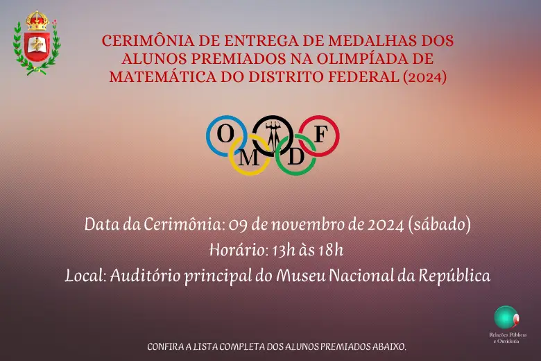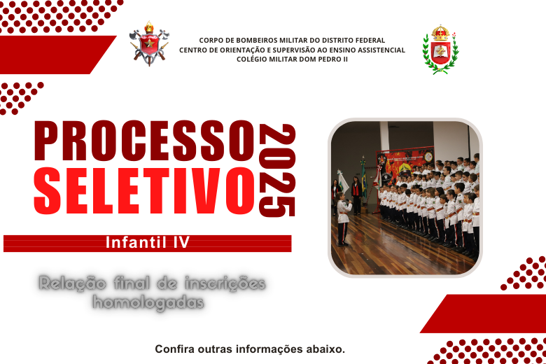 O Ten-Cel. QOBM/COMB. COMANDANTE DO CENTRO DE ORIENTAÇÃO E SUPERVISÃO AO ENSINO ASSISTENCIAL – COSEA, no uso das atribuições legais que lhe confere o art. 4o, inciso III, do Decreto Distrital no 31.817, de 21 jun. 2010, comunica que estarão abertas as inscrições do Processo Seletivo de Concessão de Bolsa de Estudos em Caráter Social do Colégio Militar Dom Pedro II (CMDP II), para o ano de 2025, e instrui os candidatos quanto a sua execução.