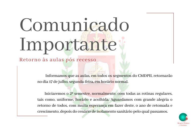 Este ano o processo de rematrícula será confeccionado de forma on-line, com a assinatura eletrônica do acordo de prestação de serviços educacionais no PORTAL ESCOLAWEB, ABA REMATRÍCULA ON-LINE – https://cmdpii.escolaweb.com.br . O Acordo 2024, está disponível para consulta no anexo desta mensagem. Pedimos que leiam atentamente o Acordo e no fim do processo cliquem em “Imprimir o Acordo” para assinar eletronicamente.