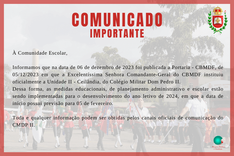 O Colégio Militar Dom Pedro II está extremamente contente com a resposta positiva da comunidade do Distrito Federal à nossa Unidade II em Ceilândia/DF. Contudo, devido à demanda que excedeu a capacidade da segunda unidade, estamos temporariamente suspendendo a aceitação de novos requerimentos até que possamos confirmar as matrículas iniciais. Após uma avaliação minuciosa, e se houver vagas disponíveis, anunciaremos novamente a abertura para requerimentos.