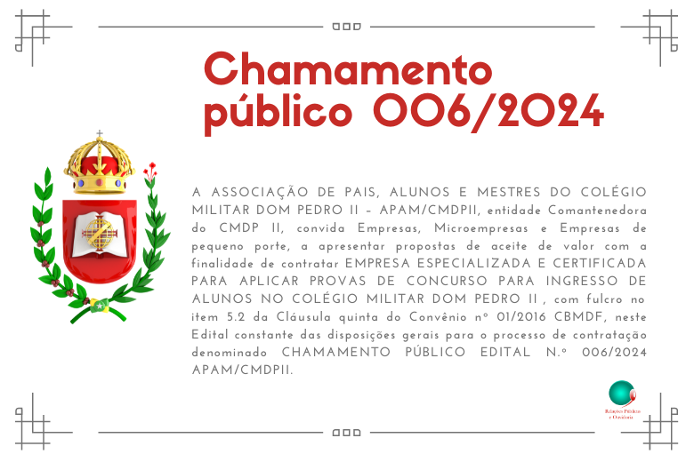 Confira abaixo o Edital para o Chamamento Público para contratação de EMPRESA ESPECIALIZADA E CERTIFICADA PARA APLICAR PROVAS DE CONCURSO PARA INGRESSO DE ALUNOS NO COLÉGIO MILITAR DOM PEDRO II.