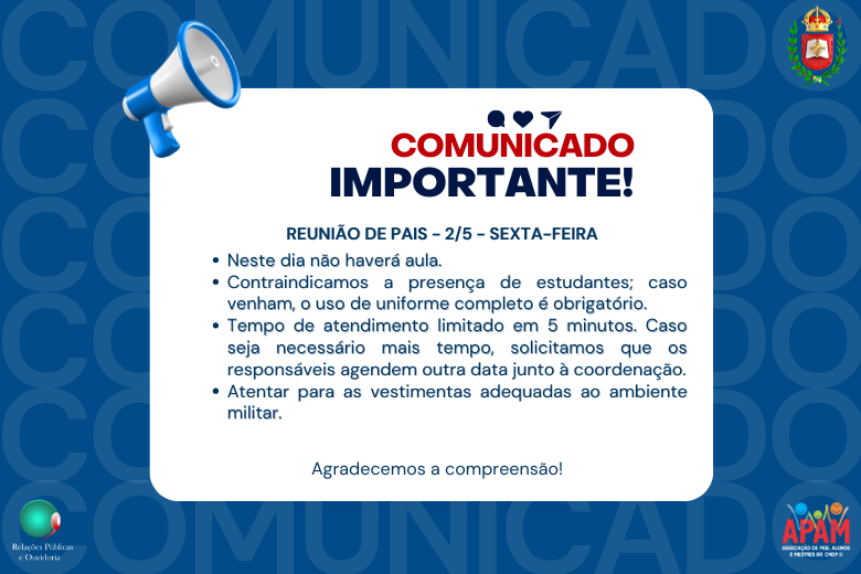 Fiquem atentos às informações e aos horários da Reunião de Pais, que acontecerá na sexta-feira, dia 02/04.