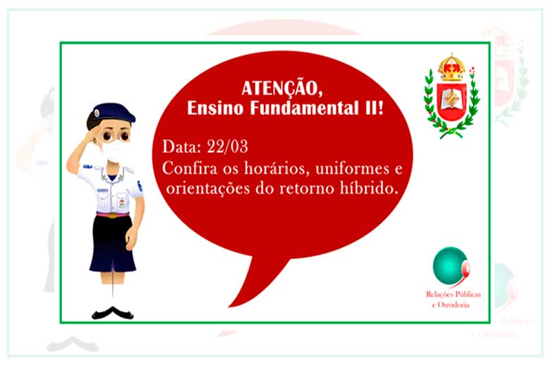 Todos os alunos, independente da opção do ensino híbrido ou do EAD, terão a mesma carga horária semanal, com 6 aulas diárias, excetuando-se um dia da semana, onde o aluno terá 4 ou 5 aulas, em virtude de adaptações referentes às atividades do Corpo de Alunos.