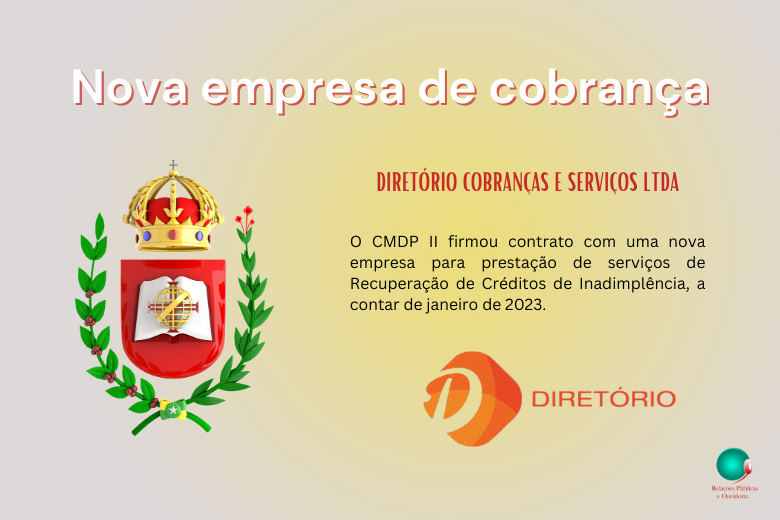 O Comando do CMDP II informa que a Empresa: DIRETÓRIO COBRANÇAS E SERVIÇOS LTDA é a nova parceira do CMDP II no que tange à recuperação de Créditos de Inadimplência.
