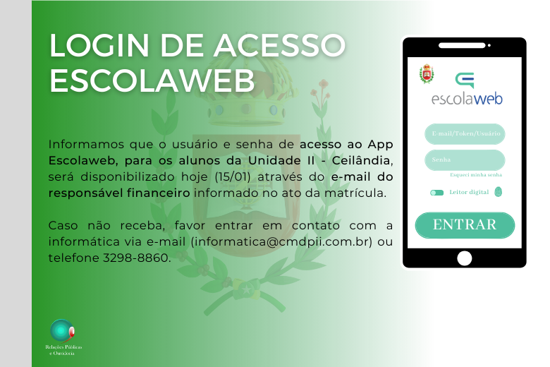 PARA ACESSAR O SISTEMA UTILIZE OS DADOS DE ACESSO ENVIADOS ACESSANDO O LINK cmdpii2.escolaweb.com.br OU ATRAVÉS DO APLICATIVO ESCOLAWEB DISPONÍVEL NA LOJA DE APLICATIVOS DO CELULAR.